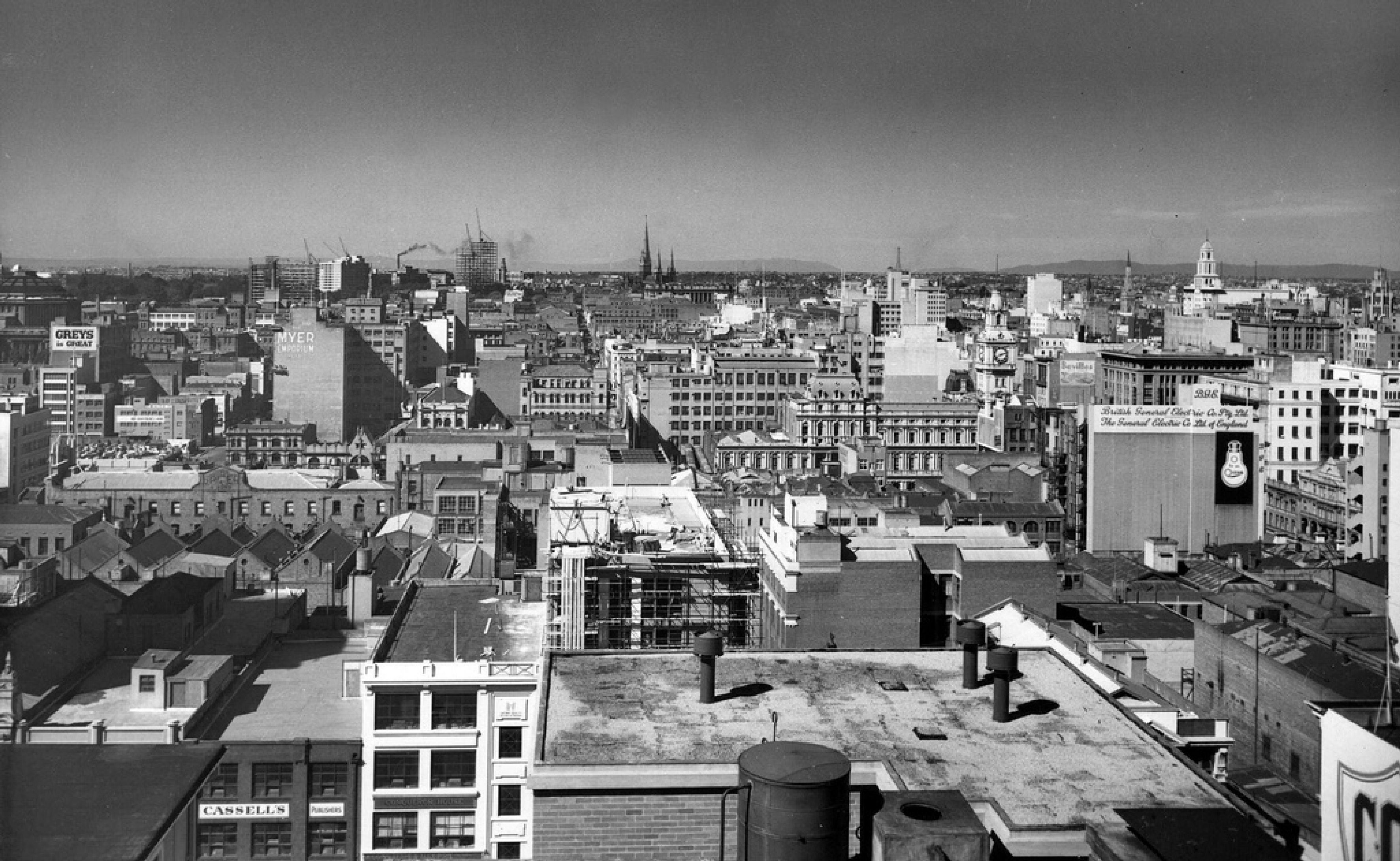 Melbourne’s skyline in the 50s was dominated by the spires of St Paul’s and St Patrick’s cathedrals, the Manchester Unity building, the Rialto building and Russell Street Police Station none of which exceeded sixteen stories. When the 20 storey ICI building was erected in East Melbourne in 1958 it was the tallest building in Australia.
