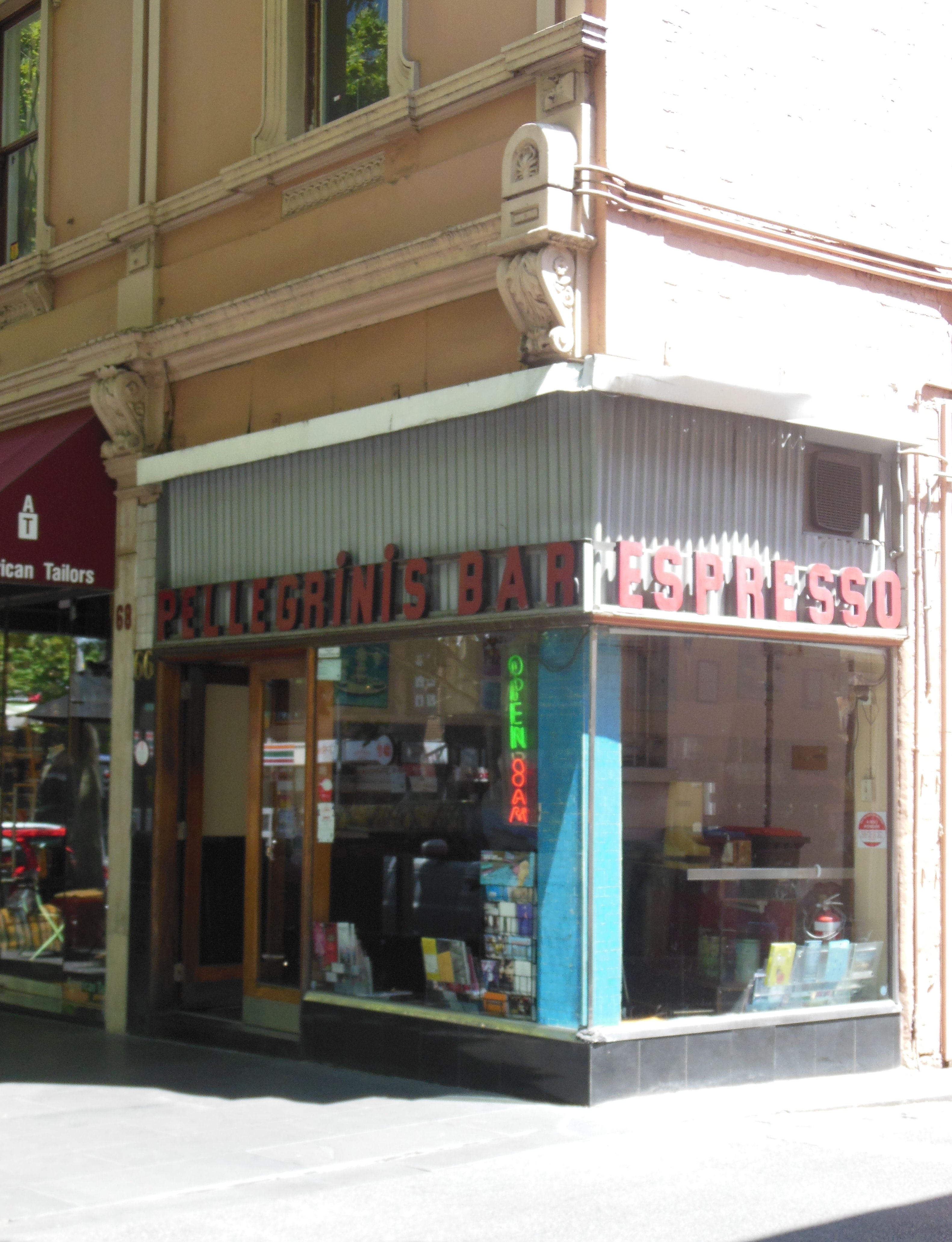 Italian and Greek cafes and eateries were making their mark and became more acceptable to Melbournians after the Olympic Games introduced an international flavour to the city. Pellegrini’s in Bourke Street, Mirka cafe in Exhibition Street, Mario’s in Brunswick, and The Gallion in St Kilda were all established by post-war immigrants. The Italians cemented the tradition of coffee drinking in the Melbourne culture. In 1953 the Gaggia espresso machine arrived in Melbourne and was installed in the Il Cappuccino café in St Kida the following year. It soon appeared in the University Café in Lygon Street and Pellegrini’s in Bourke Street.
