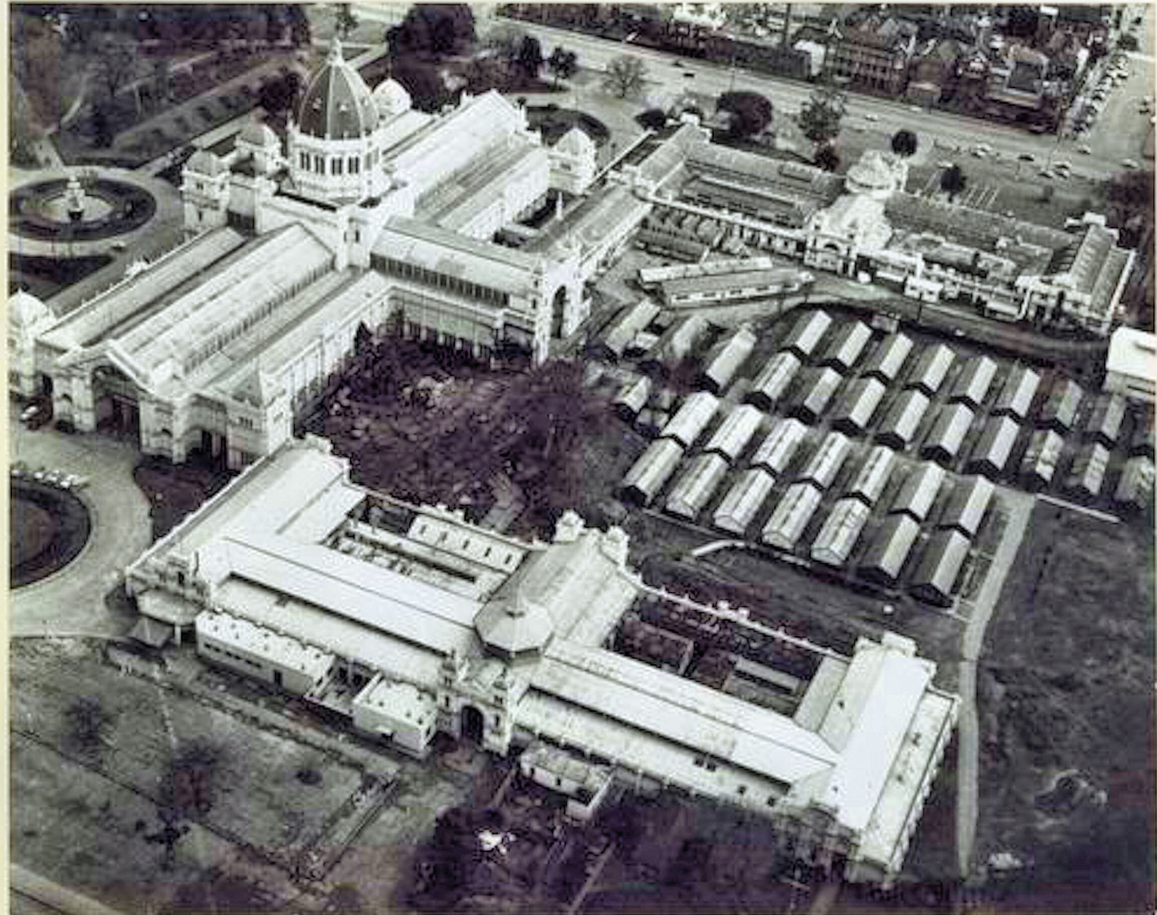 Impressive public buildings have traditionally been a feature of the Melbourne landscape. One in particular deserves a mention. The Exhibition Building stands impressively in the leafy Carlton Gardens at 9 Nicholson Street.It was erected for the International Exhibition of 1880/1. At the beginning of the 1950s it had two wings, the west and the east which were originally the machine halls for the exhibition. The grand opening of the Federal Parliament was held in the west wing in 1901. This wing subsequently housed the Melbourne Aquarium, destroyed by fire in 1953. The east wing housed a ballroom, the Palais Royale, which was remodeled as the Royal Ballroom in 1952. The area between the two wings was originally used as a sports oval, but during the war accommodated Air Force personnel. Their barracks were converted to serve as a migrant reception centre from 1949 to 1962. Matriculation exams were conducted in the building during the 1950s and the Olympic weight lifting and basketball events were staged here in 1956. The building hosted regular motor exhibitions and home shows. An assortment of government services had offices in the wings. The east wing was demolished in 1979. After much public discussion, the building was restored and entrusted to the Melbourne Museum.